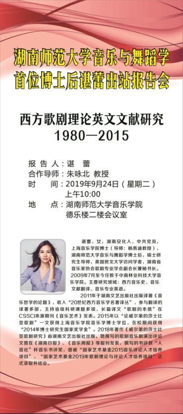 9月24日上午,湖南师范大学音乐与舞蹈学首位博士后谌蕾出站报告会于德乐楼二楼会议室圆满举行。此次是音乐与舞蹈学博士后流动站首位博士后出站报告会,因此各部门领导都非常重视,省人社厅专家服务中心(博士后管理办公室)宁登科主任、喻晔科长,湖南师范大学人事处邓正付副处长、博管办欧月娥秘书,太阳网集团tcy8722罗嵘书记、廖勇院长出席了报告会。