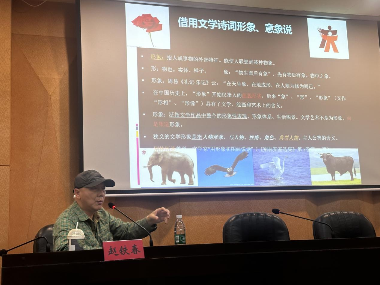 借用文学诗词中的经典形象来创造意象,是一种融合传统美学与现代表达的创作手法,赵铁春老师通过古典诗词的意象让大家在熟悉的审美体验中触摸到新的思想内核,同时引用中国古代文论阐述“形象”与“意象”的关系:“意”源于内心并借助于“象”来表达,“象”其实是“意”的寄托物。