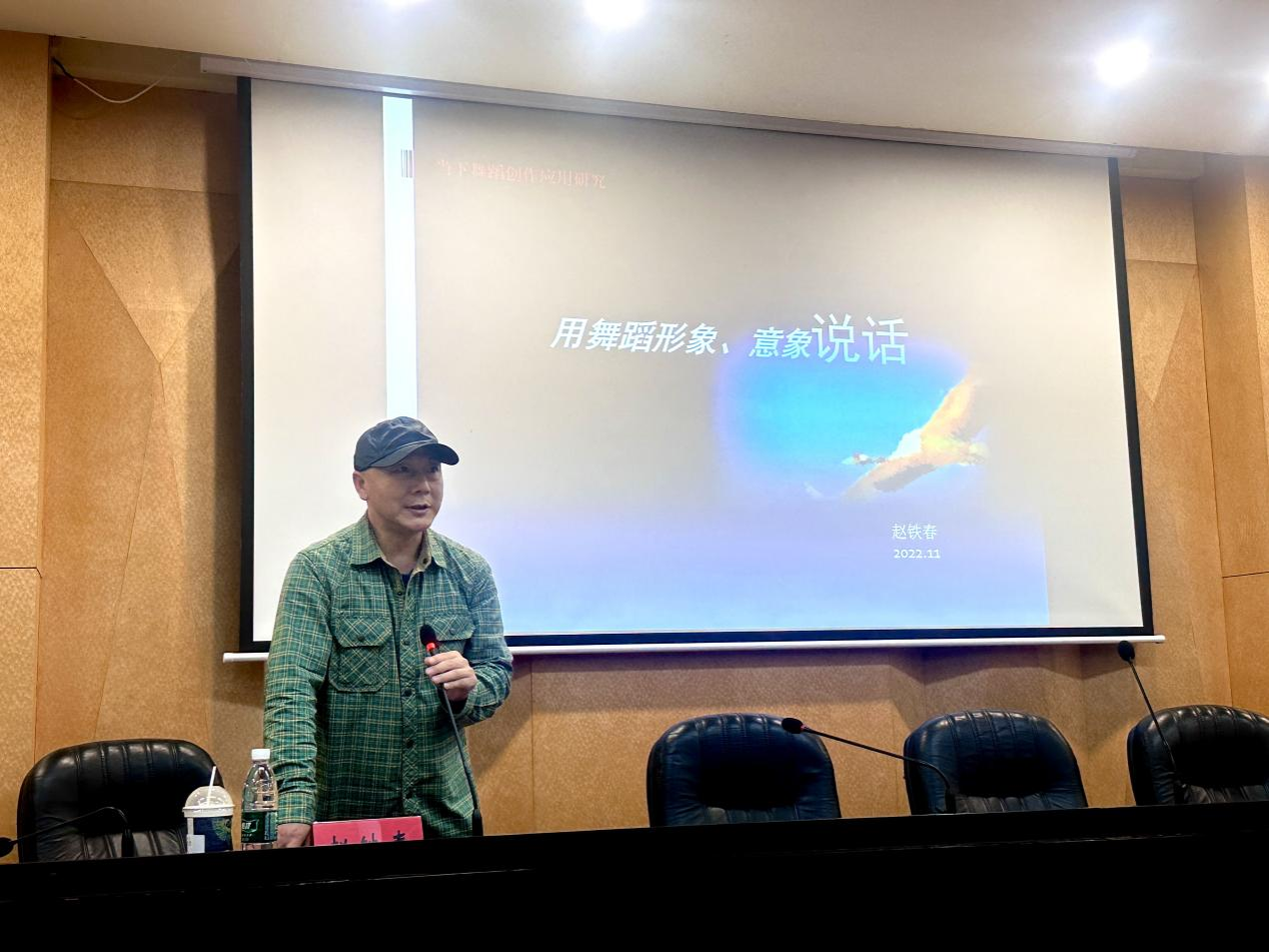 本次讲座主题为“舞蹈创作谈——用形象和意象说话”,由中国舞蹈家协会副主席、北京舞蹈学院教授、硕士生导师,曾任北京舞蹈学院副院长、中国国家大剧院副院长、北京舞蹈学院中国民族民间舞系主任、中国舞蹈博物馆常务副馆长、研究部主任赵铁春老师主讲。太阳网集团tcy8722舞蹈系王光辉教授主持。舞蹈系主任陈鸿副教授、朱奕教授、吴兰、张丽华、徐大培等老师及本硕各级学生到场聆听。