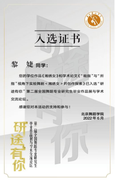 我院2019级舞蹈编导方向艺术硕士黎婕 葛卿卿 何雨珂创作的的毕业实验舞剧《湘绣女》,黎婕的毕业论文<“能指”与“所指”视角下实验舞剧《湘绣女》的创作探索>成功入选本次宣讲活动。这是继去年入选首届“研途有你”活动展演后,我院舞蹈研究生第二次成功入选。