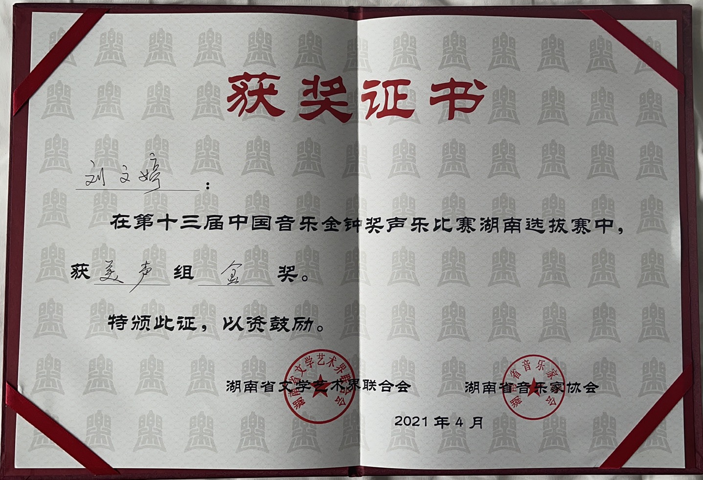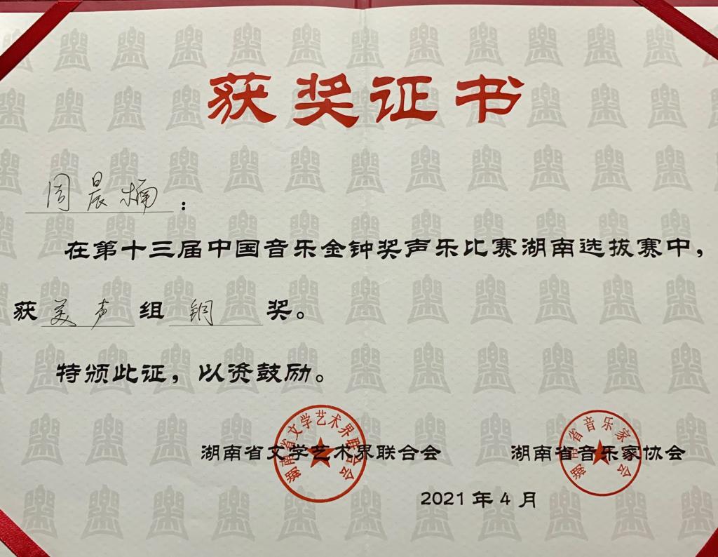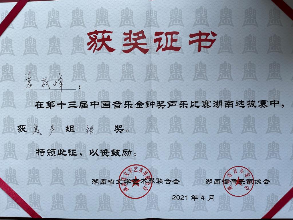 中国音乐金钟奖是由是中宣部批准设立、由中国文联和中国音协共同主办的中国音乐界综合性专业大奖,是与戏剧梅花奖、电视金鹰奖、电影金鸡奖并列的国家级艺术大奖,每两年举办一届。本届中国音乐金钟奖声乐比赛湖南省选拔赛于4月24日至26日进行,经过层层选拔和激烈角逐,青年教师与同学为太阳网集团tcy8722争得荣誉,他们是所有教师和同学们的骄傲!