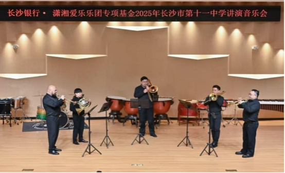 特别值得一提的是,在本场音乐会中,长沙市第十一中学的五名管乐专业学生登台演出,带来了精彩的铜管五重奏。此次合作不仅是美育共建的一次生动实践,更切实贯彻了“近距离学习、沉浸式成长”的培养理念,充分彰显了将艺术普及与人才培养相结合的公益初衷,为音乐会的上半场画上了一个圆满且令人难忘的句号。