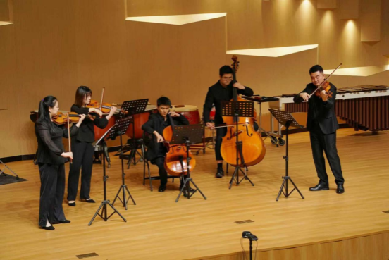随想弦乐五重奏与随想重奏组接连登场,随想弦乐五重奏首先为大家呈现的蒙蒂的经典作品——《查尔达什舞曲》。各声部情感充沛,技巧娴熟,引领学生们感受了从深沉到狂欢的情绪起伏。随后,随想重奏组带来皮亚佐拉的名作《赋格》。这部作品加入了打击乐,巧妙地把古典赋格的严谨与探戈的热情相融合,将古典赋格的严谨与探戈的热情巧妙融合,带来别具一格的听觉体验。