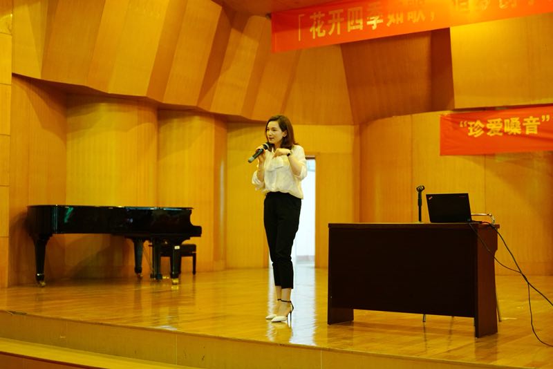 肖旭平教授以“珍爱嗓音,从我做起”为题,从嗓音的前世今生、喉部解剖、嗓音的产生、常见的嗓音疾病、嗓音训练、怎样预防嗓音疾病等方面,用图片、文字、视频相结合的方式,生动形象地进行讲解。康婷则为有发音问题的同学和老师进行发声指导,帮助大家掌握科学的发声方法,解决发音难题。