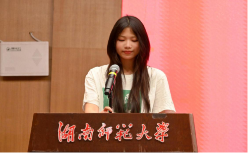 2024级本科新生代表许安珍发言。她围绕“用音符点亮梦想,用学业展望未来”的主题,表达了自己对音乐梦想的执着追求和对未来学习生活的美好期待。