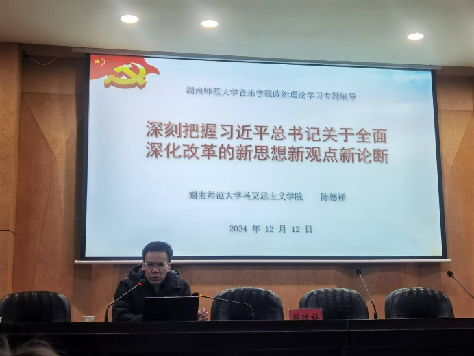 (通讯员 赵柯舒)12月12日下午,太阳网集团tcy8722在和乐楼108会议室召开全体教职工集中政治理论学习会议,邀请学校马克思主义学院副院长陈德祥教授作专题辅导报告,主题是深刻把握习近平总书记关于全面深化改革的新思想新观点新论断。学院党委书记王铁钢主持会议,全体教职员工、师生党支部书记、各班班长参加学习。