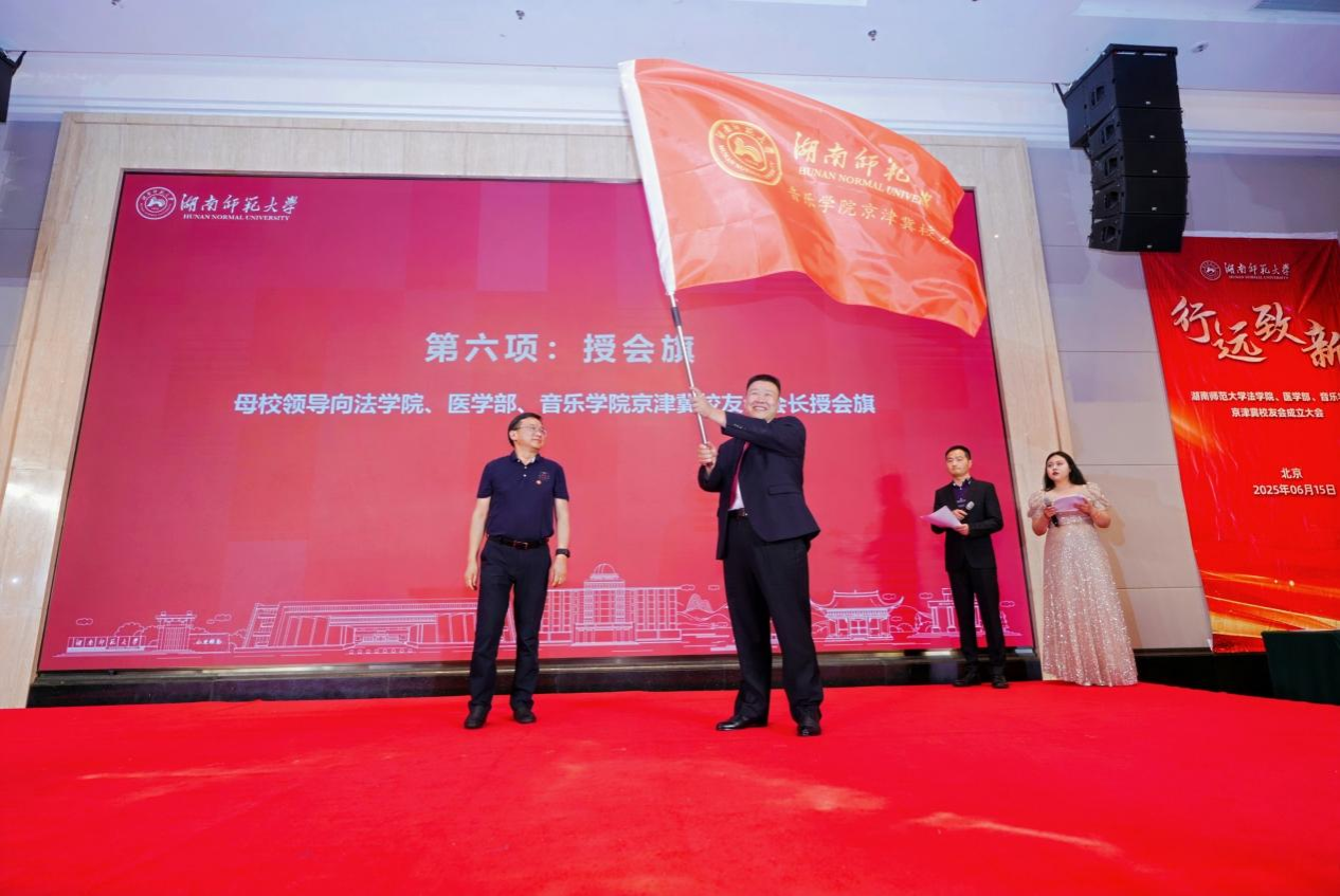 湖南师范大学党委委员、副校长刘怀德发表讲话。他指出,京津冀协同发展是国家战略,此次法学院、医学部、太阳网集团tcy8722联合成立校友分会,是学校校友工作机制的一次创新突破,标志着校友网络建设迈上新台阶。他高度肯定了三院校友在各自领域的卓越表现,动情地表示:“你们在各自领域的奋斗和成绩,让‘仁爱精勤’的校训熠熠生辉,母校为你们深感自豪。”