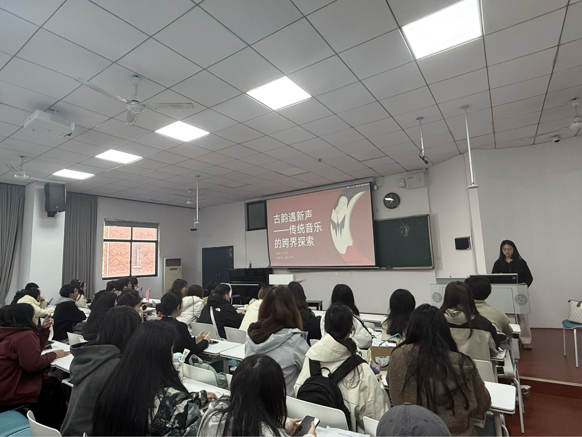 主讲人从传统音乐发展的当代困境出发,引导同学们探索其跨界创新之路。她以古筝与电子音乐的合作、古琴与新媒体的舞台交互、唢呐与摇滚乐的风格碰撞为例,具体阐释了不同乐器在现代语境下的转化路径。随后,她通过现场播放《孤勇者》古筝改编版、《青花瓷》二胡演绎片段等视频,引导同学们感受传统乐器在流行文化中的全新生命力。活动尾声,主讲人强调,跨界并非消解传统,而是借助现代的表达手段与新平台,让传统音乐以更生动、更亲切的方式呈现在大家面前,使其在当代焕发新的活力。同学们纷纷表示,通过丰富的视听实例,对传统音乐的当代价值有了更直观的认识,也激发了自身在专业学习中尝试融合创新的兴趣。