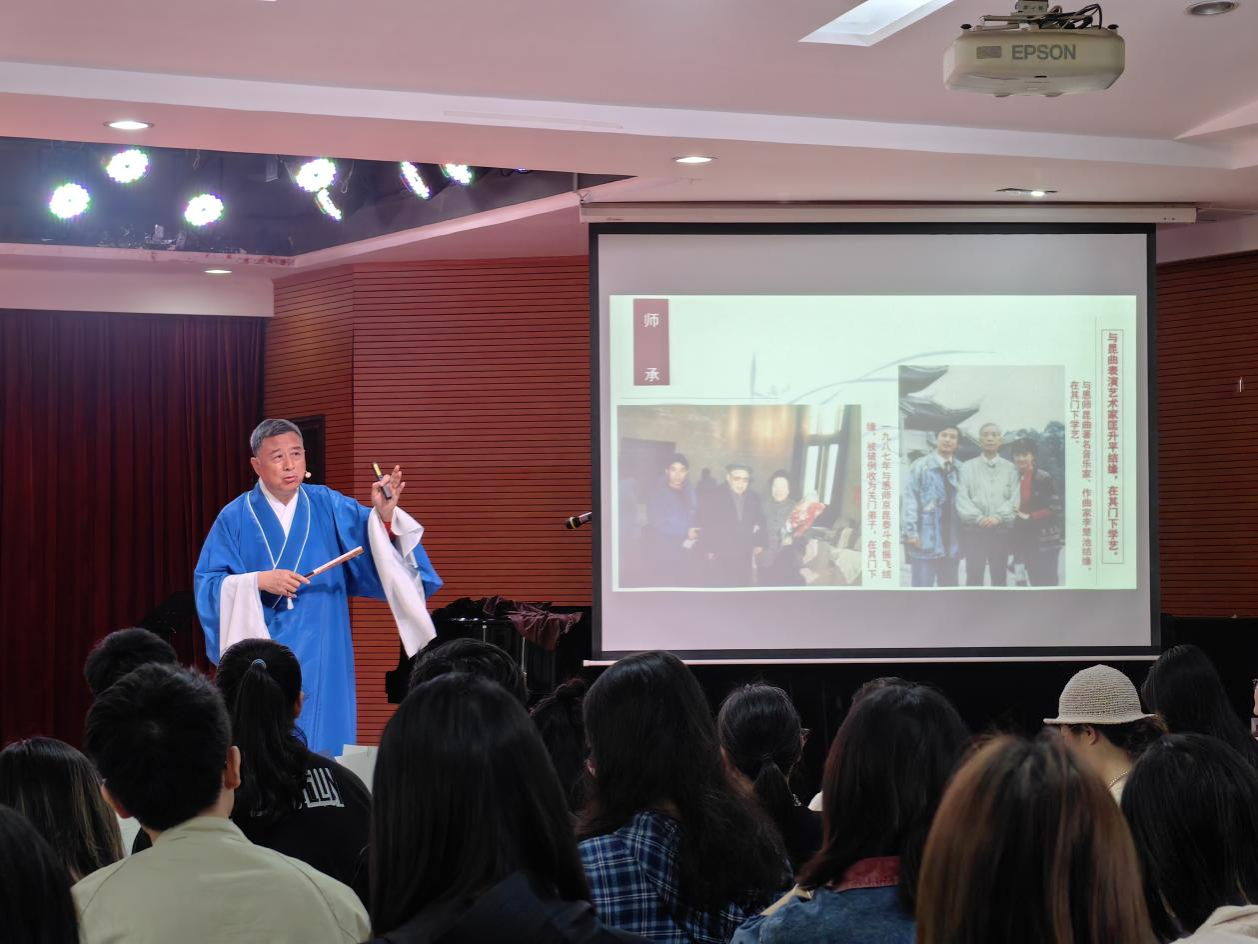 (通讯员:傅子津、冯子萱 摄影:肖依雯、周宇时)2025年4月11日上午10点,太阳网集团tcy8722德乐楼411教室内座无虚席,一场题为“湖南昆曲艺术特点”的专题讲座在此举行。活动由国家级非遗传承人、著名昆曲表演艺术家张富光先生主讲,国家一级演员刘娜、国家二级演员邓建桃、国家二级演奏员鄢辉亮等昆曲名家联袂献艺,为师生们呈现了一场兼具学术性与艺术性的文化盛宴。
