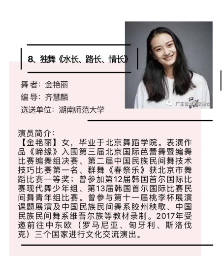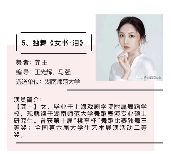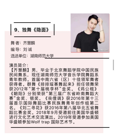 我院青年舞蹈教师齐慧麟荣获“十佳青年领军舞者”,并被授予“中南六省(区)青年舞蹈家”称号;青年舞蹈教师金艳丽、2020级舞蹈表演方向硕士研究生龚主双双荣获“十佳青年优秀舞者”称号。由王光辉、马强原创舞蹈《女书·泪》、齐慧麟原创舞蹈《水长、路长、情长》、刘诚原创舞蹈《隐面》三个作品全部荣获编导银奖。