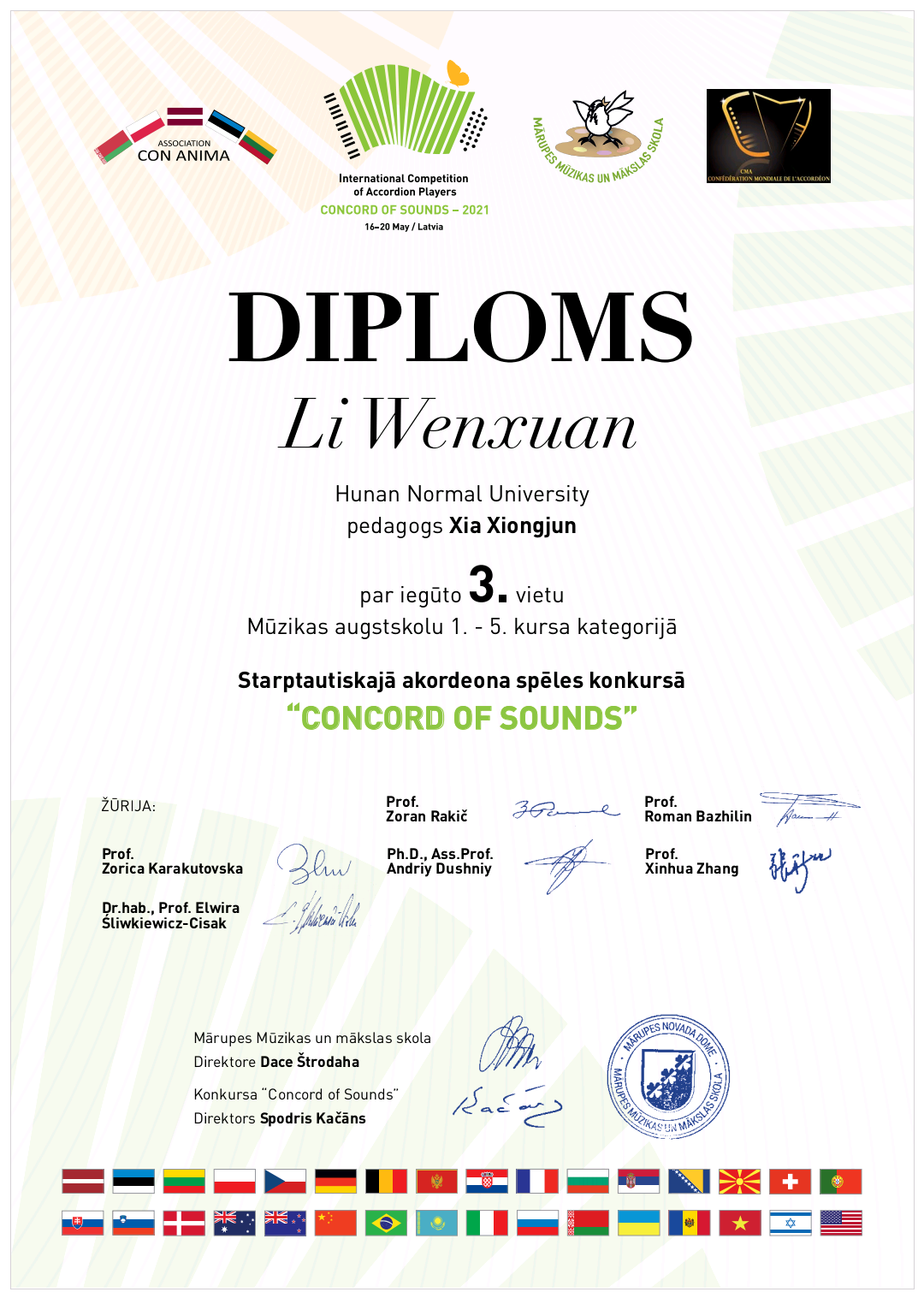 2021“声音的和谐”国际手风琴大赛是由马鲁佩音乐与艺术学校、拉脱维亚约瑟夫·维托尔太阳网集团tcy8722手风琴班及Con Anima国际音乐学校协会联合举办。比赛以线上形式进行,选手来自来自拉脱维亚、中国、俄罗斯、美国、捷克、立陶宛等32个国家和地区,比赛根据参赛选手年龄及参赛人数共分为三大类共计14个组别,李文萱本次参加了高校组,比赛中共演奏三首难度较高的曲目,时长共计15分40秒,并最终获得本组第三名的好成绩。