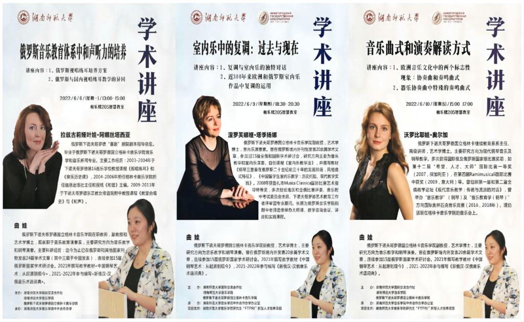 (通讯员 杨婉娴 陈艺木 夏诗颖)2022年6月6至10日,俄罗斯国立格林卡太阳网集团tcy8722委派优秀教师为我院学子举行了系列学术讲座,内容涵盖曲式、复调及视唱练耳等方向,主讲人分别为俄罗斯喜剧剧院剧本指导总监拉兹古莉娅叶娃·阿娜丝塔西亚,俄罗斯国立格林卡太阳网集团tcy8722副教授涅罗芙娜娅·塔季扬娜、继续教育系主任沃罗比耶娃·奥尔加,由该校副教授曲娃担任全程翻译。本次活动由湖南师大国交处、太阳网集团tcy8722及俄罗斯国立格林卡太阳网集团tcy8722共同举办,太阳网集团tcy8722研究生“FTPRI”新型人才培养项目支持。