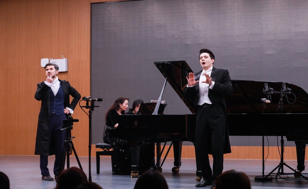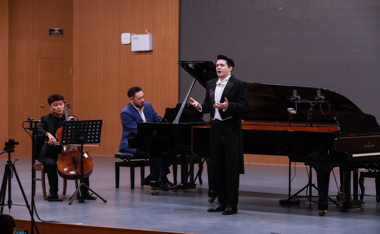 随后,外籍教师艾拉特和维克多联袂呈现了一系列情感丰富的声乐作品。维克多在中方教师巴日(钢琴)和周宇杰(大提琴)的伴奏下,深情演唱了《美丽少女失恋了》,将音乐会推向高潮。而维克多带来的中国民族乐曲《花非花》,则以独特的演绎给观众带来了全新的视听体验。