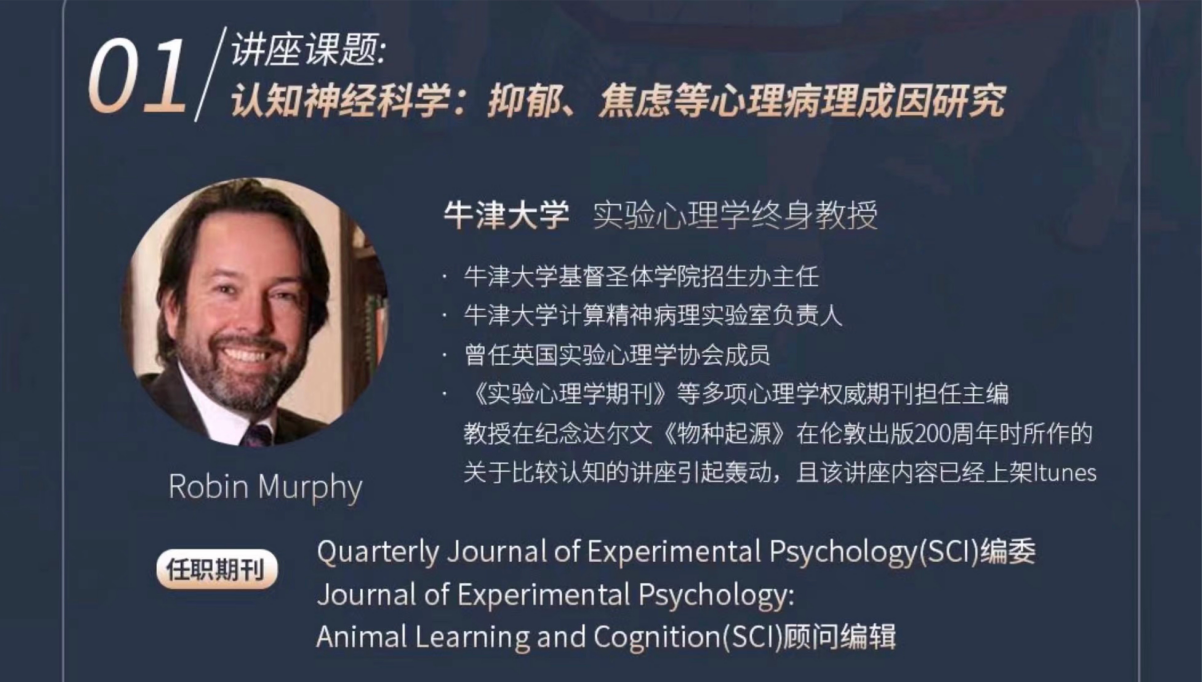 6月19日下午2:30在和乐楼108教室,牛津大学实验心理学教授Robin Murphy以“认知神经科学: 抑郁、焦虑等心理病理成因研究”为主题,向2020级音乐学(师范)专业师生做线上课程讲座分享。其通过基础心理学研究方法论和计算层面的分析,以人的行为 (学习和动机) 和认知 (记忆和注意力) 为基础,来研究人的精神疾病。教授从介绍心理学基础理论 (动物学习与行为模型)开始,后进一步介绍计算理论 (错误修正理论和自由能量原理),及这些理论如何与神经生物学的基础知识一起被应用于人类心理病学的研究;同时就个体差异也与大家进行深入探讨。通过对这些研究的发现与理解,教授引导学生探讨神经生物学和神经递质作用、多巴胺的作用和血清素在学习和情感中的作用、抑郁症,恐惧症,饮食失调,精神分裂症、注意力障碍等的心理病理成因。